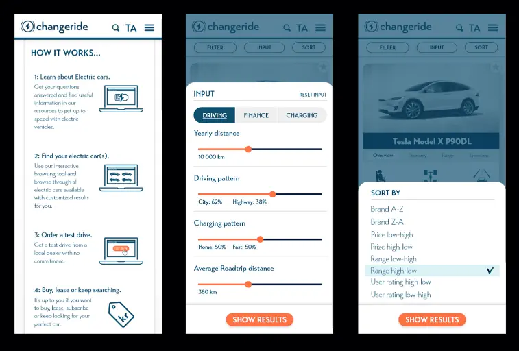 Tidlig i prosessen ble det lagt stor vekt på å forstå både brukerbehov og funksjonalitet. Sammen med Changeride jobbet vi med å definere hvordan tjenesten skulle oppleves, både visuelt og teknisk, og hvordan brukerne skulle guides gjennom valg og sammenligning av elbiler.